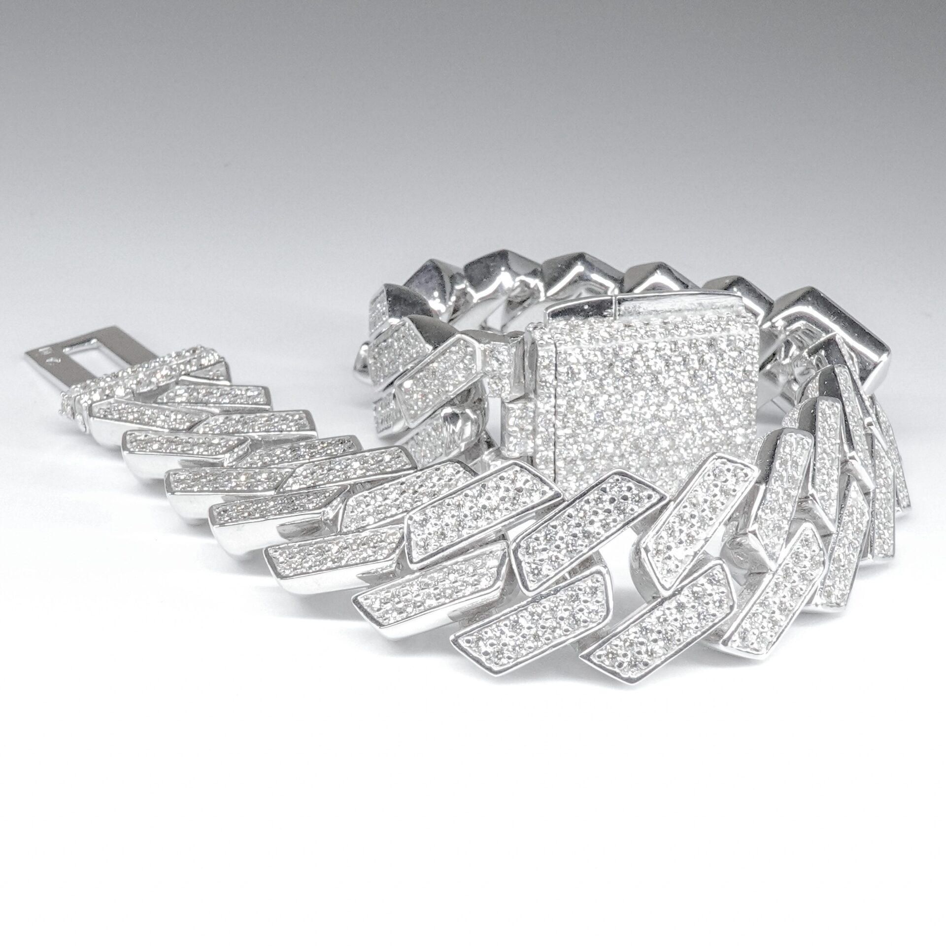 Bransoletka Cuban Link 20mm wysadzana błyszczącymi moissanitami, dorównującymi blaskiem diamentom. Masywna, elegancka i wyrazista — wykonana w Polsce z dbałością o każdy detal.