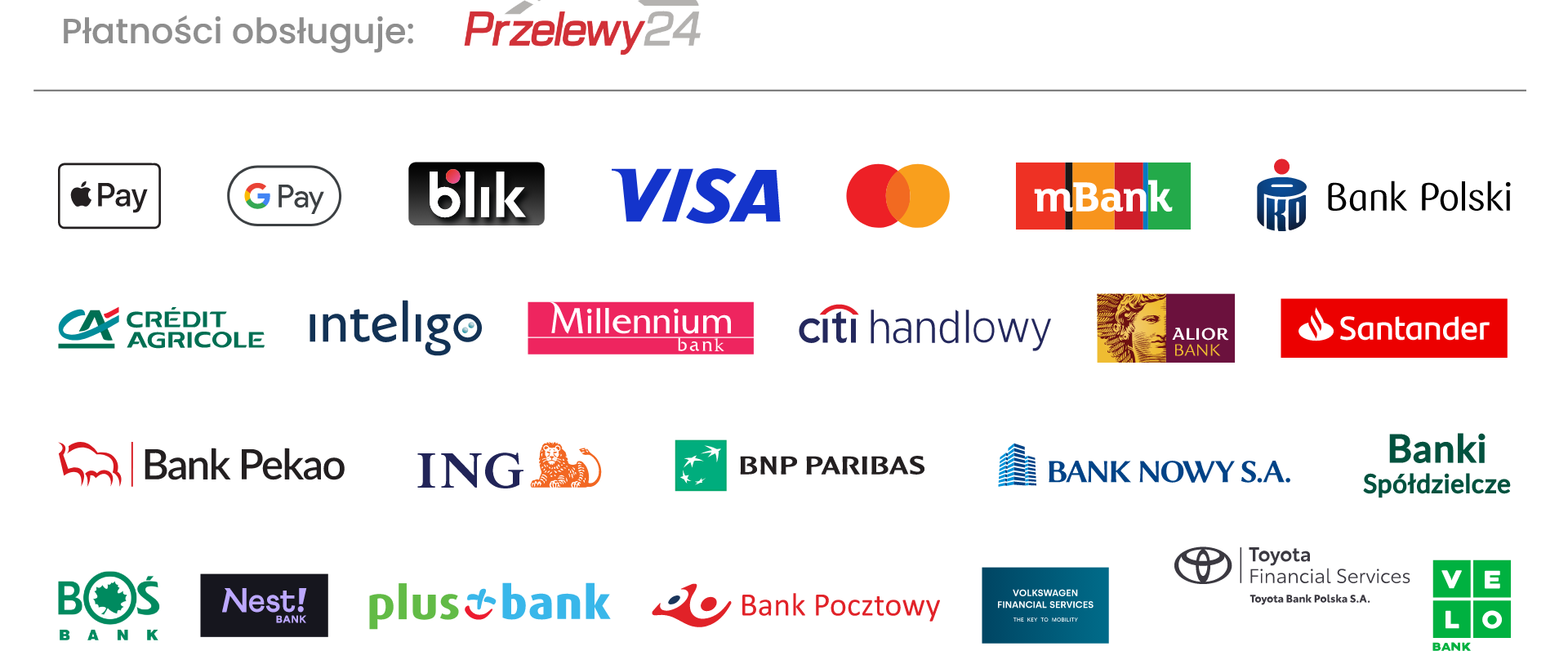 Akceptujemy płatności kartami kredytowymi i debetowymi (VISA, MasterCard) — bezpieczna obsługa transakcji przez system ING/iMoje gwarantuje ochronę Twoich danych.